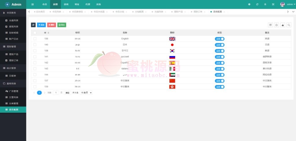 前端支持 9种语言切换,后台可自由控制语言显示或隐藏。